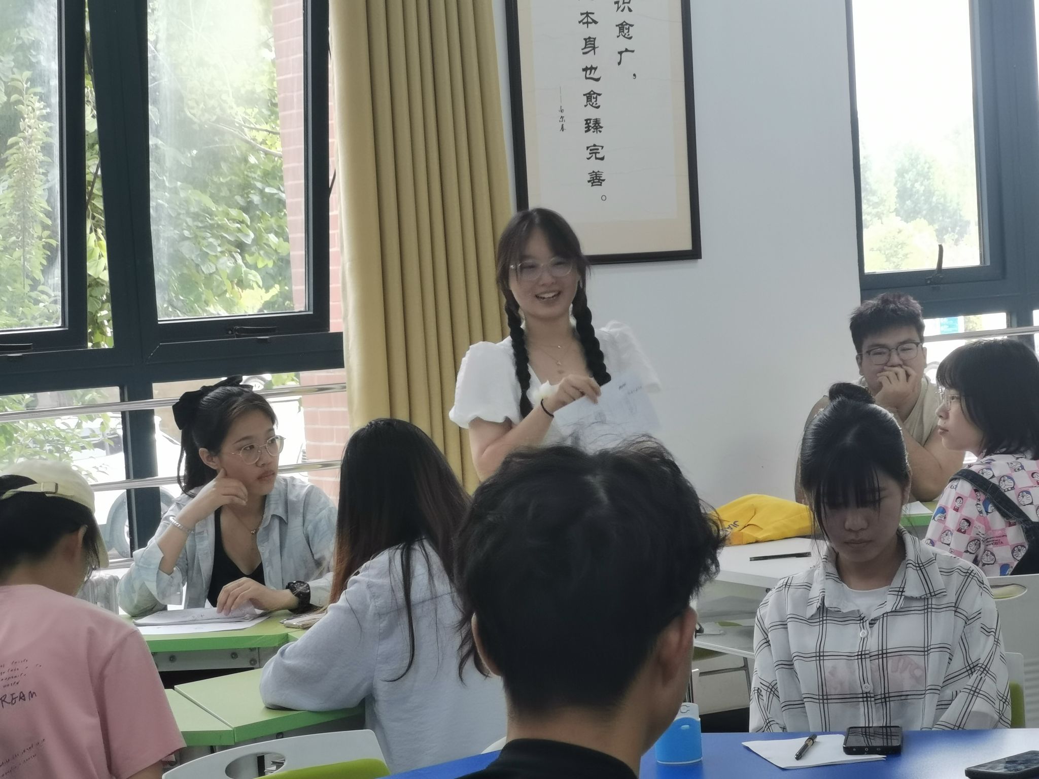 活动伊始,孙玉平引导同学们自行组队,并指出此次活动的目的,帮助同学们迅速融入到活动中去。随后,她把同学们分为A、B两组,让A组的同学主动认识B组的同学,接着身份互换,让B组的同学主动认识A组的同学。该环节以巧妙的方式让同学们破冰,主动认识他人,促进同学的互动。接着,孙玉平让同学们用一种颜色在纸上表达破冰活动的心情,并在小组中交流。这种自我反思和认知的过程有助于同学们更好地了解自己,增强自我意识和自我理解。之后,孙玉平让同学们从个人角度用画笔描绘自己,用三个关键词概括自己,并映射出一种代表自己的动物。最后,孙玉平让同学们分享自己的画作并为同学们介绍自己。通过回顾此次活动的收获、感受以及思考下次见面的交流对话,为此次活动画上一个圆满的句号。