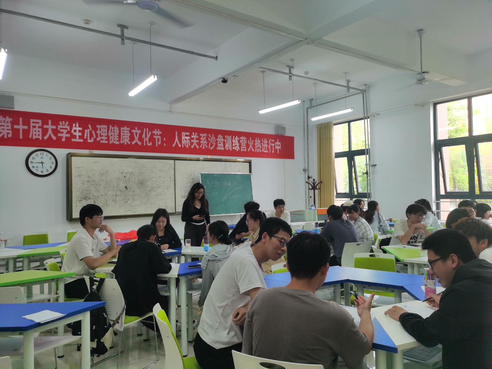 为拓展同学们的第二课堂学习空间,丰富大学校园文化生活,拉近同学们之间的距离,同时关注大学生心理成长现状,5月21日下午,由学生工作部(处)心理健康教育与咨询中心主办、工商学院承办的河南理工大学第十届大学生心理健康文化节人际关系沙盘训练营第一期个人成长绘画心理分析活动在综合实验大楼105举办。国家二级心理咨询师,学工办主任孙玉平担任指导老师。