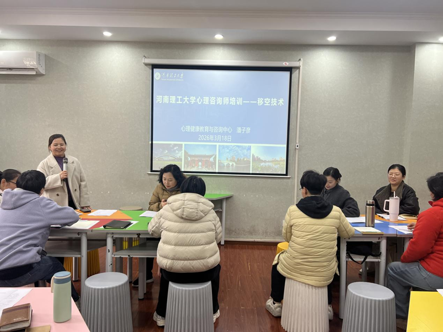 本网讯(通讯员 尹兴凤)为进一步提升心理咨询师专业技能,优化心理健康咨询服务质量,2026 3 18 日下午,学校心理健康教育与咨询中心在团体辅导室 111 开展移空技术专题培训。本次培训由心理中心专职教师潘子彦主讲, 30 余名心理咨询师参加学习。