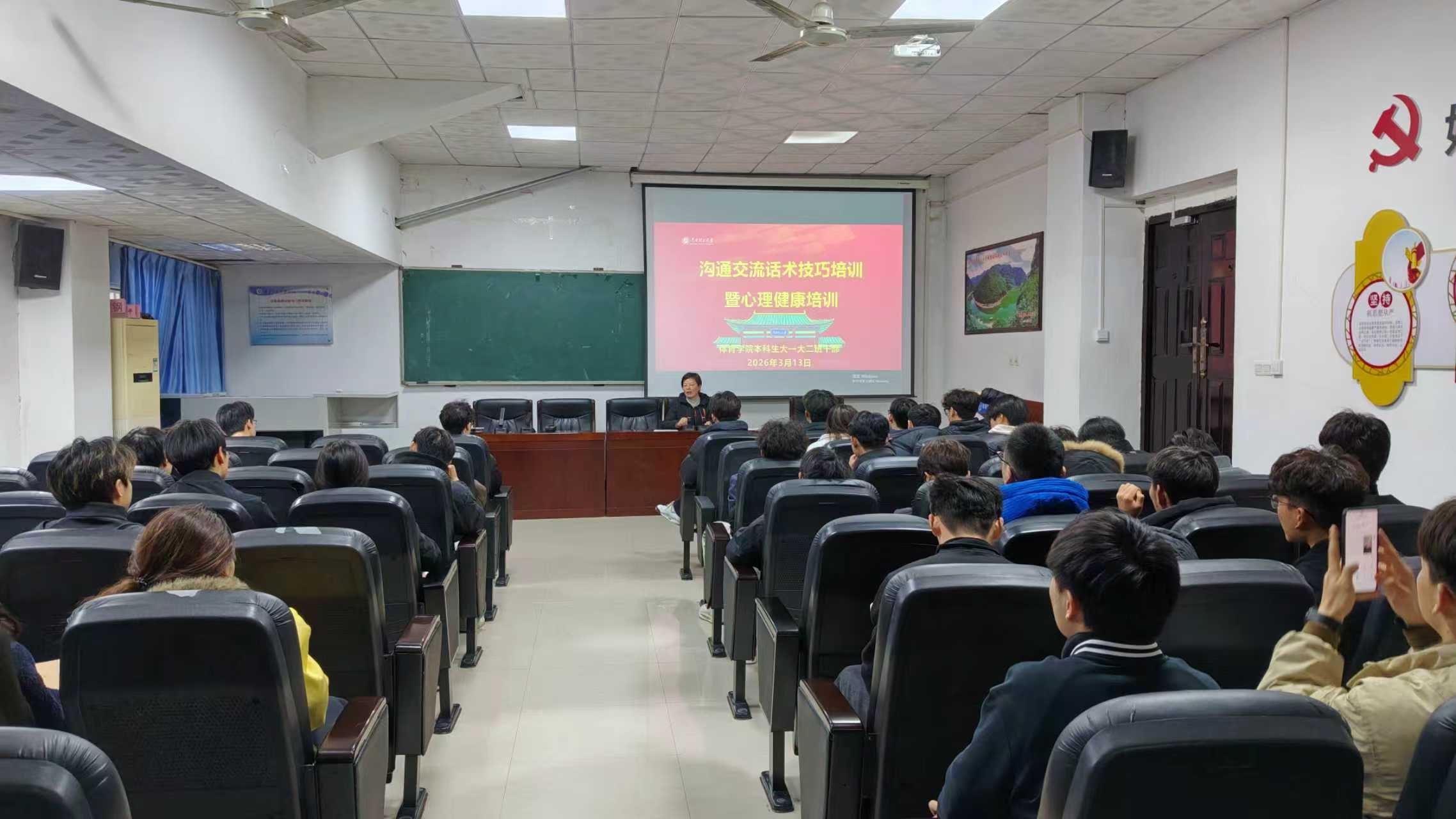 本网讯(通讯员 毛雅良 黄会娟)为助力学生掌握沟通技巧、培育健康心理,构建和谐校园氛围,2026年3月13日,体育学院组织开展沟通交流话术技巧暨心理健康专题培训,全体学生参与,黄会娟老师主讲。