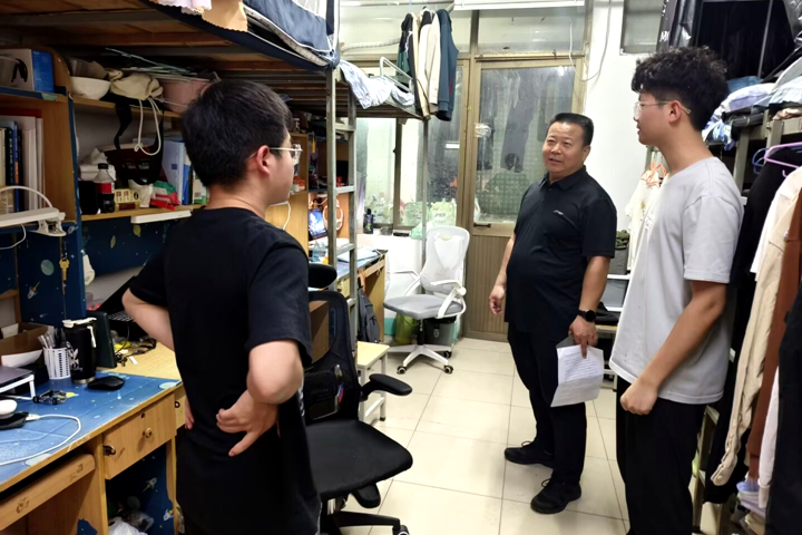 走访过程中,张艳明与学生亲切交谈,细致询问学生的假期安排,针对投身学习科研的学生,肯定学生进取精神并建议合理规划时间:针对准备实习的学生,提醒学生做好前期准备,在实习中学习知识;针对参加竞赛的学生,鼓励学生大胆创新,利用学校资源争创佳绩。同时,各年级辅导员老师认真查看宿舍生活设施,了解水电,网络状况,叮嘱学生注意宿舍卫生,做到勤打扫、常通风,时刻牢记用电安全,不违规使用电器,外出务必锁好门窗。