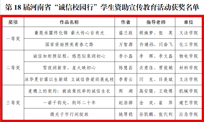 近日,由河南省教育厅、河南省人力资源和社会保障厅、中国人民银行河南省分行、国家金融监督管理总局河南监管局、国家开发银行河南省分行联合主办的第18届河南省“诚信校园行”学生资助宣传教育活动评选结果揭晓,我校共有8篇作品获奖,获奖作品的数量位居河南省高校前列。