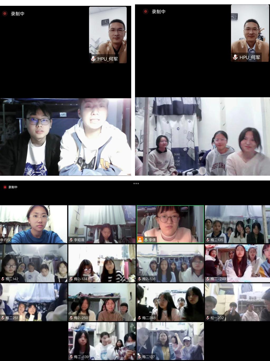 活动伊始,学生们以宿舍为单位集体出镜,何军对大家在学习和生活等方面存在的困惑予以解答并表示关切,他倡导每一位学生都应秉持“以终为始”的生涯理念,充分剖析个人优势与理想信念,明晰自身兴趣、明确性格特征、拓展技能素质,在勇攀知识高峰的学业进程中树立并践行社会主义核心价值观。随后,学生们逐人进行自我介绍,在深刻剖析自身特点及优势特长的基础上,就个人的职业生涯规划进行分享,同时,宿舍长对本宿舍积极向上的学风建设和热烈浓厚的宿风营造进行客观向上的展望。何军在与各宿舍同学讨论交流的过程中,对每位同学精彩而深入的发言表示高度赞许、对宿舍长美好而向上的展望表示大力支持,并有针对性地对学生们进行了生涯教育和就业指导,提醒同学们在严峻且复杂疫情形势下,要严格遵守学校防疫政策,以保证个人身心健康为第一要务,以缪力同心、攻坚克难的积极防疫态度同全校师生共克时艰,以青年学子朝气蓬勃的精神风貌及学生宿舍凝聚向心的热烈氛围献礼党的二十大。