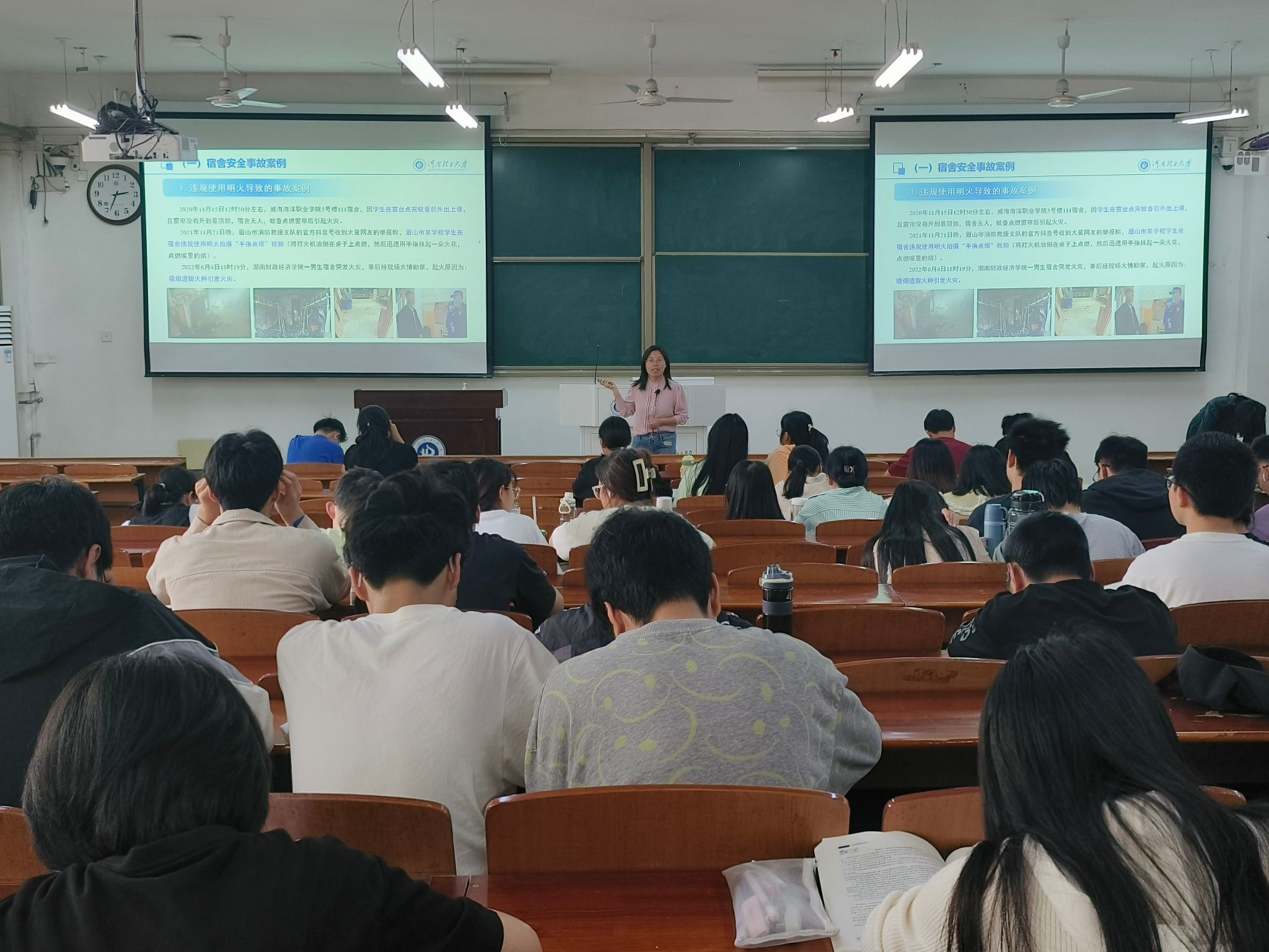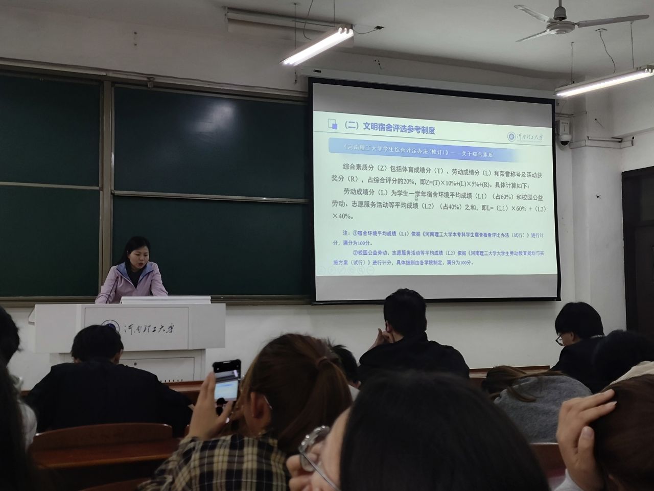 班会上,老师们首先通过宿舍安全事故案例和图文并茂的PPT,让同学们对宿舍安全的重要性有了更深刻的认识,做到警钟长鸣,慎终如始。接着,详细讲解了《河南理工大学学生宿舍安全管理办法(修订)》等管理规定,阐明了宿舍安全关系你我,为同学们营造宿舍温馨氛围做了制度保障。最后,老师们从思想政治好、学风建设好、文明素养好和安全卫生好四个方面,分享了文明宿舍创建的思考。