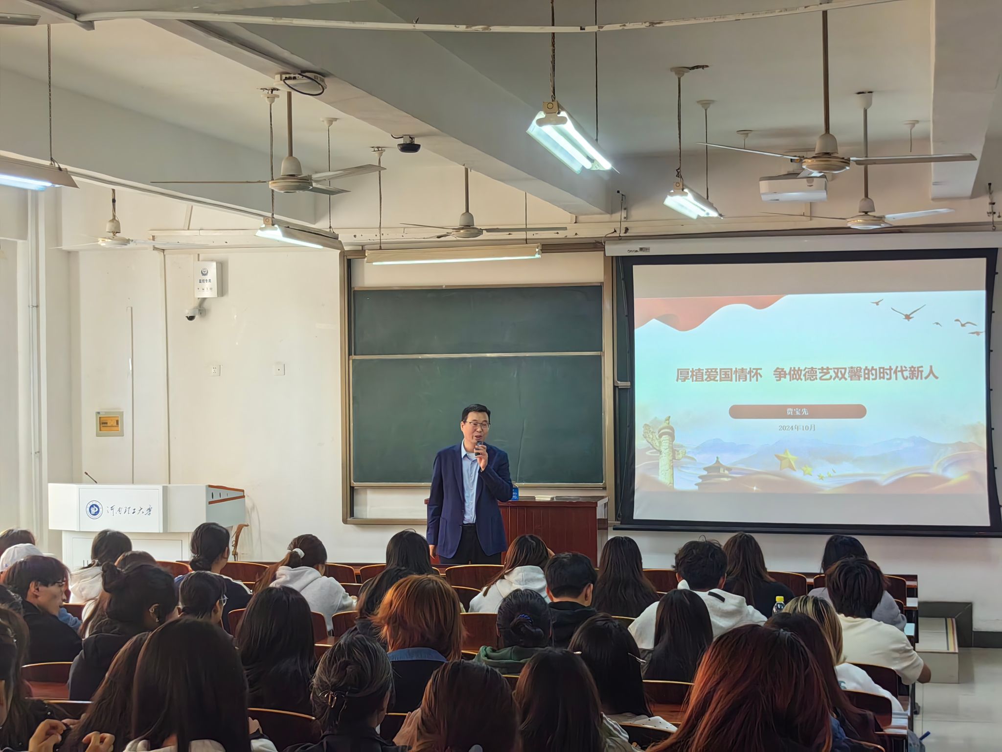为厚植学生爱国情怀,引导其尽快适应大学生活并成为德艺双馨的时代新人,10月29日下午,音乐学院党委书记贾宝先在文综楼307教室以《厚植爱国情怀,争做德艺双馨的时代新人》为题,为学院2024级全体新生上了一堂生动的思政课。