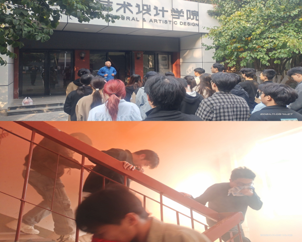 演练开始前,该院学工办金欢老师对消防演练情况进行了详细的部署和安排,校保卫处老师到现场进行了指导。演练过程中,全体学生按照预先制定的应急预案,迅速有序地撤离到安全区域。整场消防演练模拟了火灾发生时的逃生技能、人员疏散、灭火自救等应急处置场景,包括火灾烟雾和警示音的模拟。