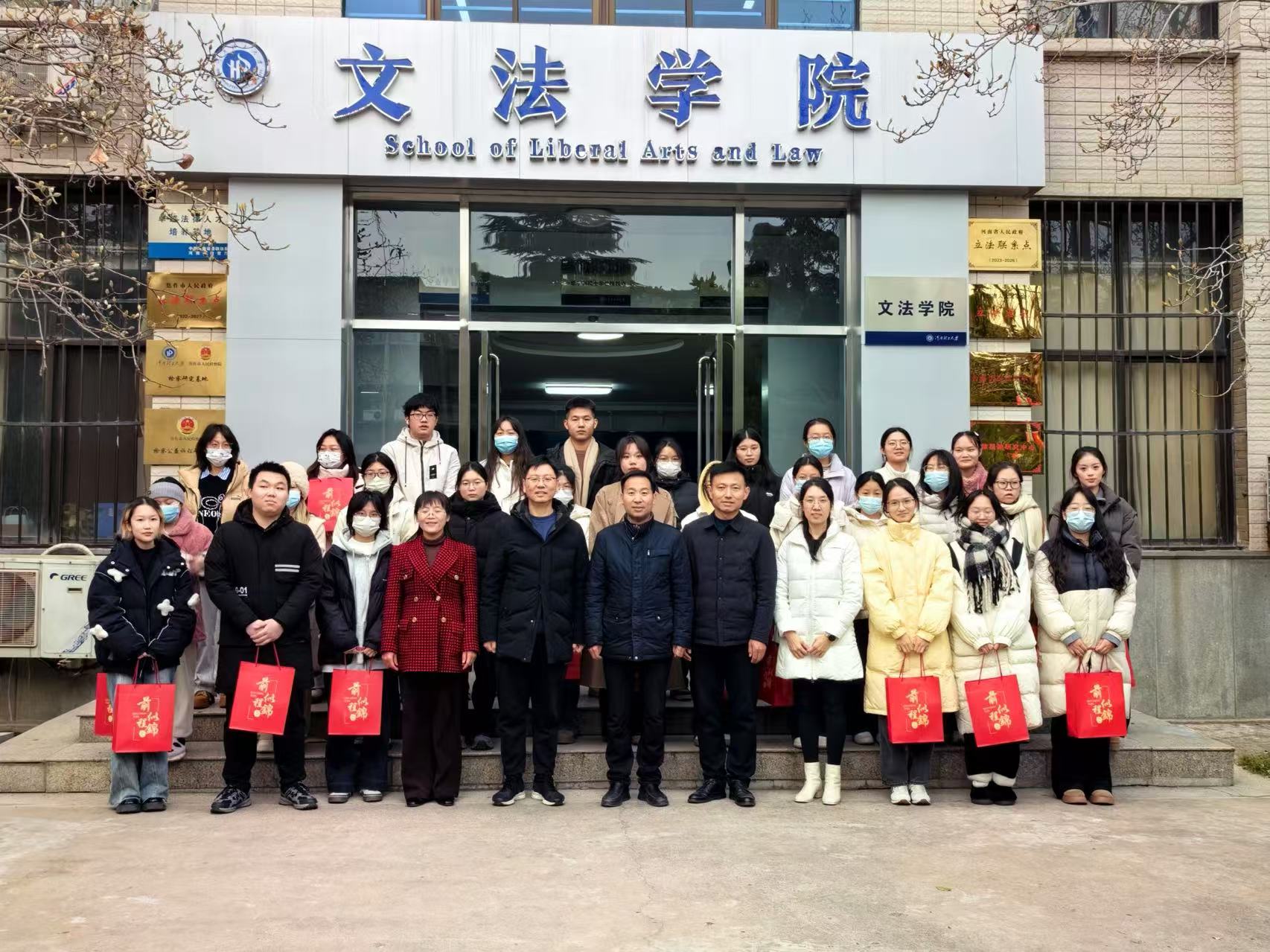 为了帮助考研学子缓解备考压力,坚定考研信心,积极冲刺迎考,12月5日下午,文法学院与诚正书院开展“温情助航 ‘研’路生花”考研慰问活动,在院楼121会议室为考研学子送上考研暖心大礼包。诚正书院党委书记孙彦、诚正书院党委副书记李旭升、22级辅导员任美斌和2021级考研学生代表参加活动,活动由文法学院副院长张海媚主持。