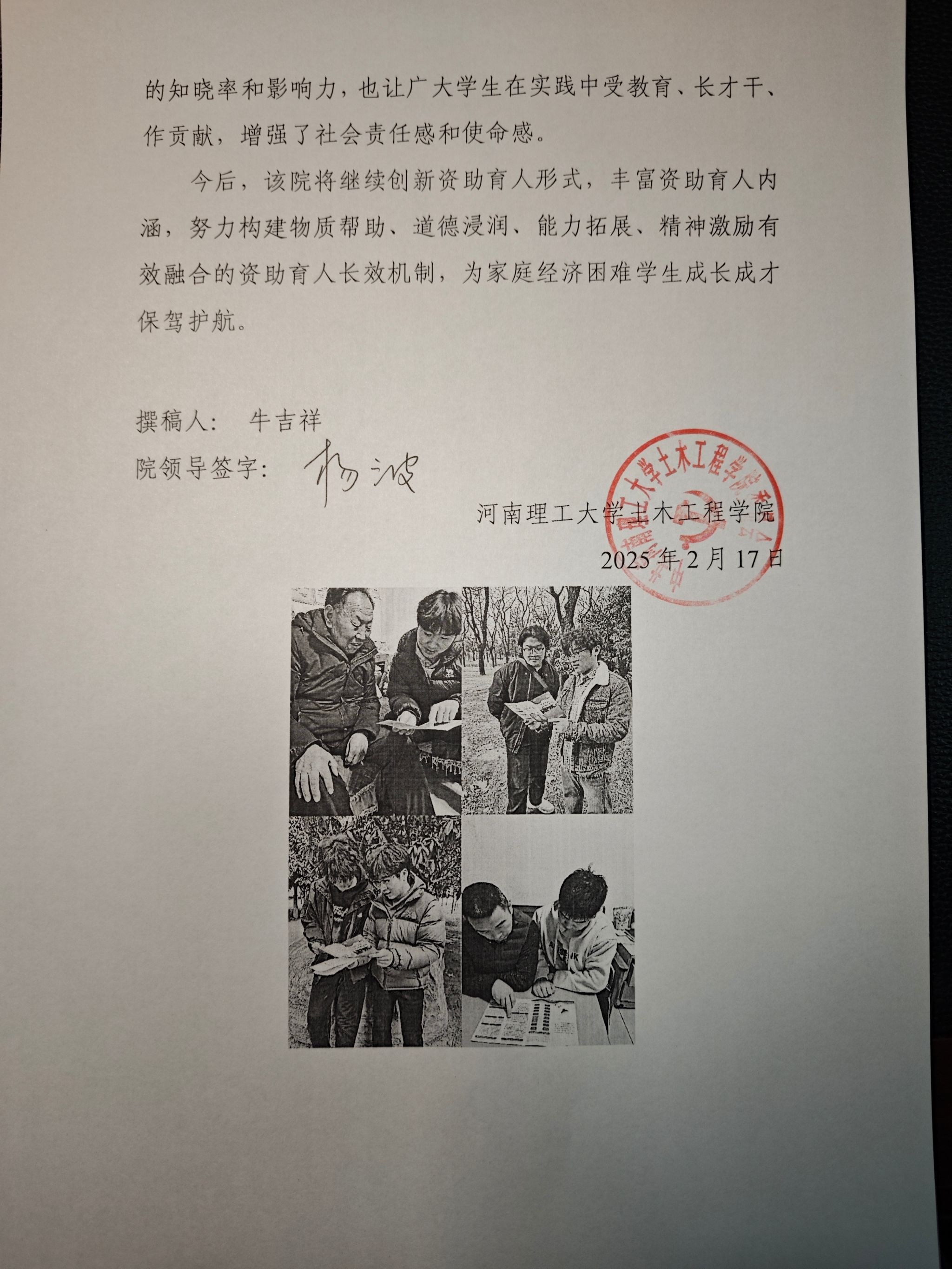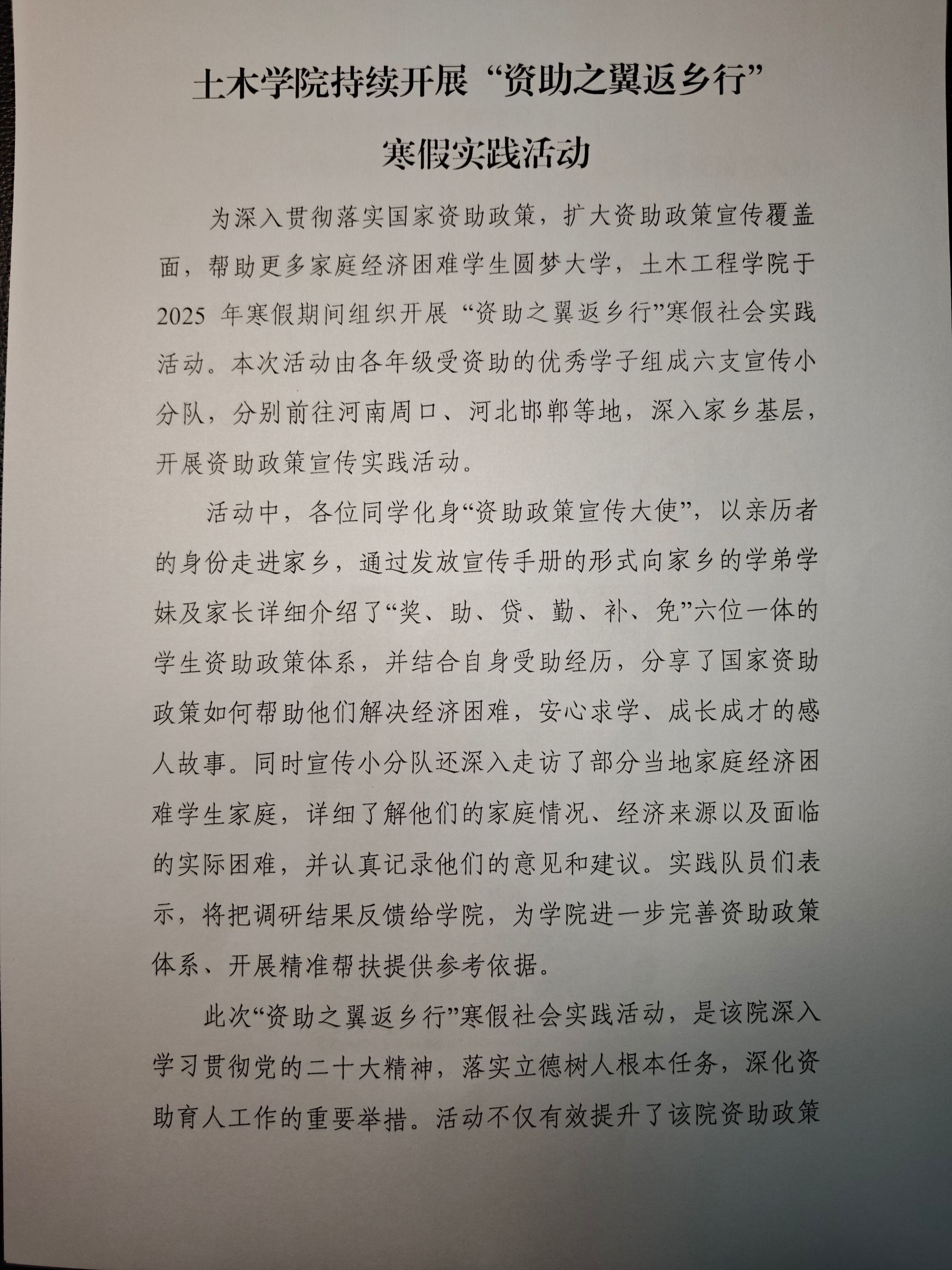 为深入贯彻落实国家资助政策,扩大资助政策宣传覆盖面,帮助更多家庭经济困难学生圆梦大学,土木工程学院于2025年寒假期间组织开展 “资助之翼返乡行”寒假社会实践活动。本次活动由各年级受资助的优秀学子组成六支宣传小分队,分别前往河南周口、河北邯郸等地,深入家乡基层,开展资助政策宣传实践活动。