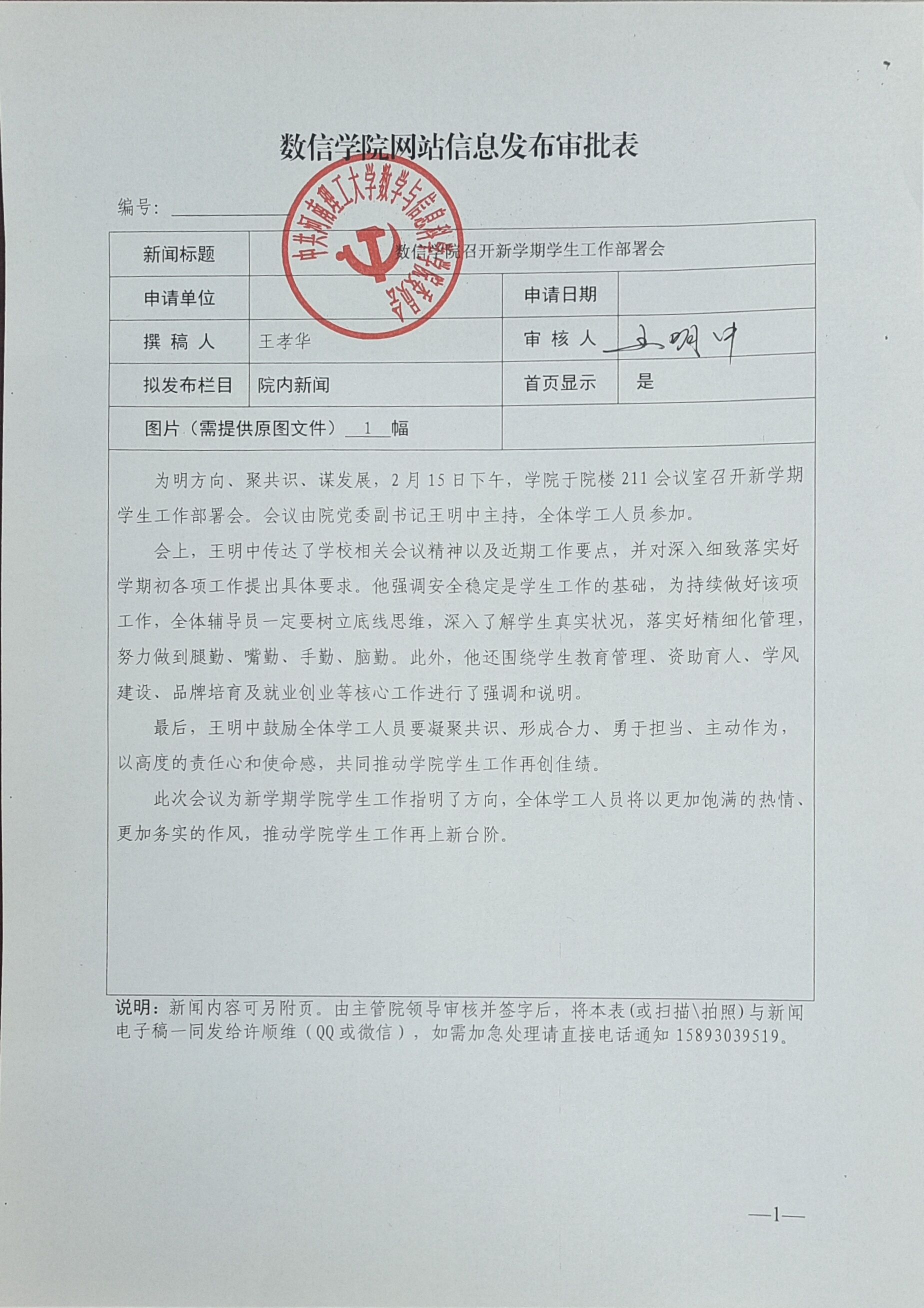 为明方向、聚共识、谋发展,2月15日下午,学院于院楼211会议室召开新学期学生工作部署会。会议由院党委副书记王明中主持,全体学工人员参加。