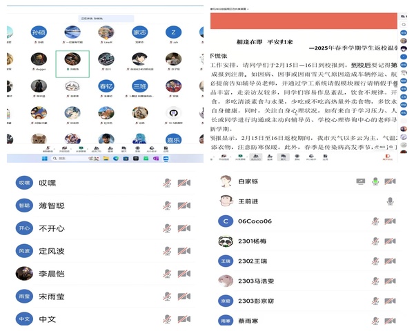 在线上班会上,辅导员们围绕《2025年春季学期学生安全温馨提示》的内容,结合实际情况,进行了深入浅出的讲解和讨论。他们不仅强调了安全的重要性,还通过案例分析、互动问答等方式,引导学生深入思考,增强自我保护意识。
