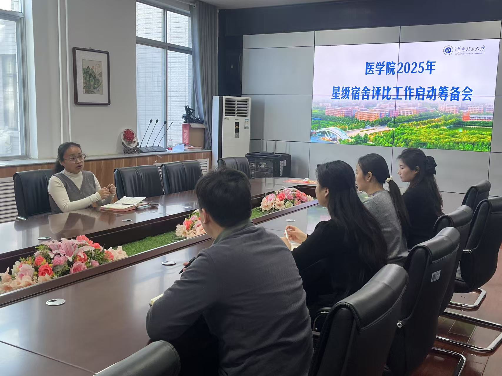 为充分发挥宿舍在学生思想政治教育和综合素质教育中的重要阵地作用,优化学校育人环境,落实《河南理工大学学生星级宿舍评比办法(试行)》(豫理工党学〔2025〕1号)文件精神,结合《河南理工大学学生住宿管理办法》(校学〔2016〕24号)、《河南理工大学宿舍安全管理规定》(豫理工后勤〔2024〕4号)等宿舍管理相关规定,打造卫生整洁、文明和谐的宿舍文化氛围,医学院召开星级宿舍评比工作启动筹备会,党委副书记朱丹及全体专职辅导员参会。