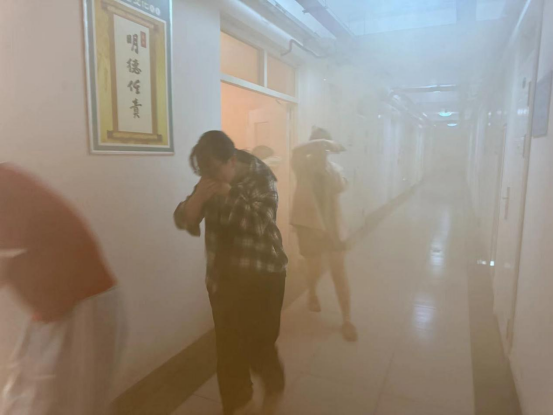 随着培训环节结束,演练进入了紧张的模拟阶段。工作人员在5号、8号宿舍楼指定区域释放烟雾弹,顷刻间模拟火场浓烟弥漫,警报声骤然响起,全体师生迅速响应。在疏散引导员的指挥下,大家严格遵守“低姿、捂口鼻、沿墙行”的逃生要领,沿着预定疏散路线快速、有序地撤离至室外安全集合点。整个过程紧张而有序,达到了预期目标,充分检验了应急预案的可行性与师生们的实战反应能力。