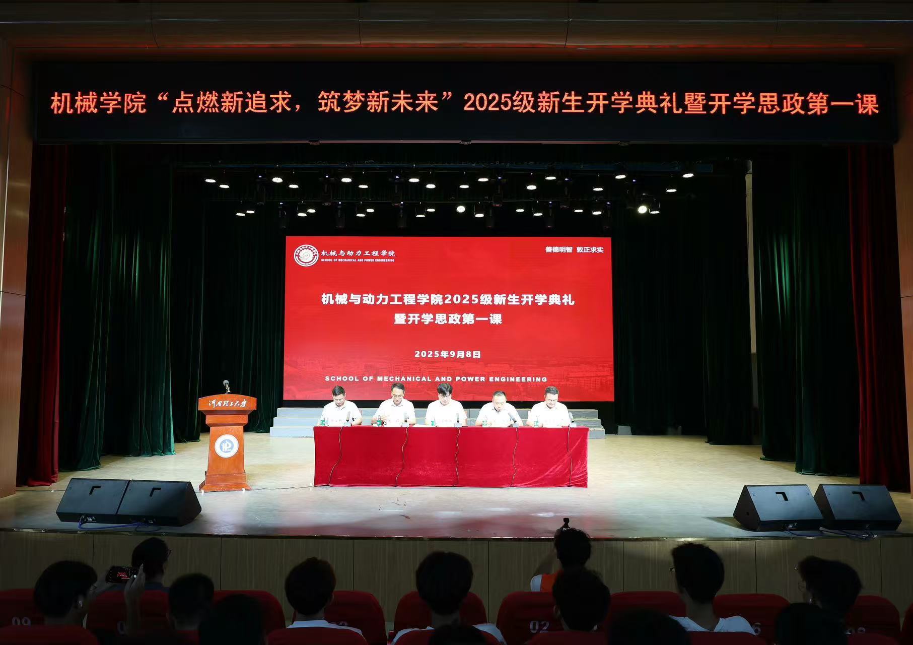 点燃新追求,筑梦新未来。9月8日晚,机械学院2025级新生开学典礼暨开学思政第一课在学校小礼堂隆重举行。学院领导班子成员、教师代表、辅导员、2025级班主任及全体本科新生共同参加了本次活动。