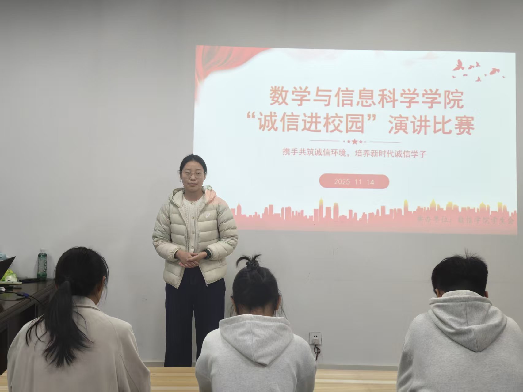 本网讯(通讯员 詹子墨 买俊杰)为深入培育和践行社会主义核心价值观,强化师生诚信素养与责任担当,营造风清气正的学院氛围,11月14日下午五点三十分,我校数信学院于学院106教室举办了“诚信校园行“演讲比赛。