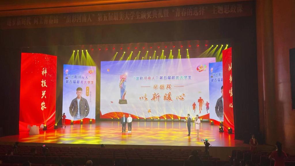 近日,“出彩河南人”第五届最美大学生宣传推介活动结果揭晓,我校电气学院辛岳芃荣获本届“最美大学生”称号。10月14日下午,在省委宣传部、省委教育工委、省教育厅等多部门联合主办的“出彩河南人”第五届最美大学生颁奖典礼暨“青春的选择”主题思政课活动上,辛岳芃到现场领奖,音乐学院20余名师生参演节目《平凡的我们》。