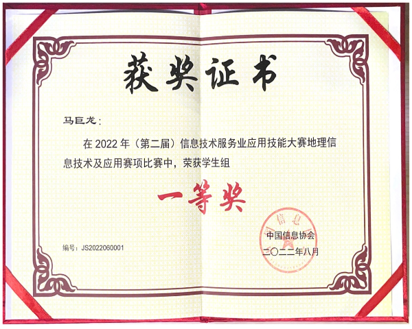 2022年8月3日,由中国信息协会主办,易智瑞信息技术有限公司、中科地信(北京)遥感信息技术研究院承办的“第二届地理信息技术与应用技能大赛决赛”顺利举行。我院2019级地球信息科学与技术专业的马巨龙同学与海内外160多家高校院所和生产单位选手同台竞技,经过两轮激烈的奋战与角逐,最终该同学作为个人参赛选手荣获一等奖(排名第一),文广超老师荣获地理信息技术与应用技能大赛优秀指导老师。