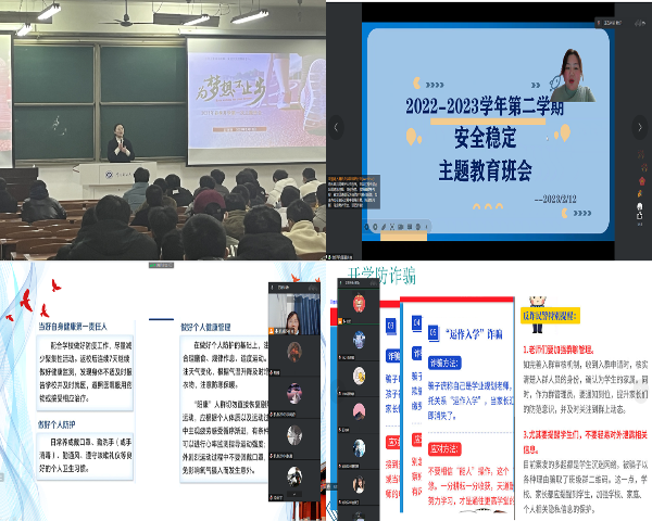 班会上,辅导员老师们主要围绕“班风宿风学风”、“疫情防控”、“网络诈骗”三个大方面开展安全稳定主题教育班会,一是学风班风宿风建设方面,要求学生创建文明宿舍环境、预防宿舍安全,不做违反校纪校规之事,强调学生时刻以《学生手册》中的相关规定约束自己的学习行为,并结合新学期的开学考试,对大家发出严守考试纪律的倡议,坚持诚信考试;二是疫情防控方面,随着疫情政策的调整,疫情防控也进入了后疫情时代,提醒学生要做好个人防护和个人健康管理,按时进行晨午体温检测。如发现有咳嗽、发烧等身体异常情况,务必及时上报,到校医院进行就诊,督促学生根据身体情况加强体育锻炼,提升身体素质;三是网络诈骗方面,结合多例大学生因为经验不足而屡屡受到诈骗的真实事件再次向学生们强调网络电信诈骗的特征以及其危害,不要轻易相信陌生人,不要随便浏览网站,更不要轻易汇款,保护好自己的财产安全。