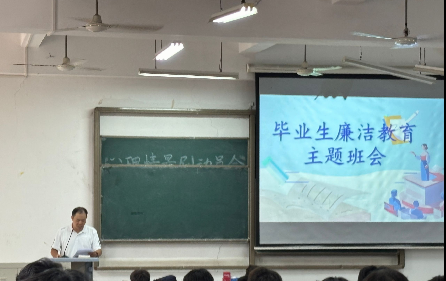 6月18日上午,数信学院毕业生辅导员胡华伟为毕业生们做廉洁从业教育。他通过两个廉洁小故事告诉大家,生活中处处是考验,生活里处处要廉洁,希望毕业生们要坐得住板凳、耐得住寂寞、经得住诱惑;要勤学,强化理论修养;要修德,涵养清廉之德;要明辨,学法知法守法;要笃实,勤勉务实从业;要常怀报国之志,锤炼过硬本领,牢记嘱托,清风启程,廉洁从业。