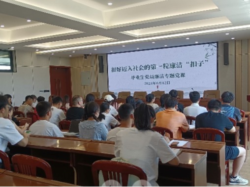 资环学院党委副书记孙付伟以“加强党风廉政建设,扣好人生第一颗纽扣”为题,面向毕业生党员讲授了廉洁教育专题党课,从“坚守理想信念”、“修身立德”、“守住底线”、“加强学习”、“吸取教训”、“要慎交朋友”六个方面教育毕业生党员以案为鉴、警钟长鸣,时刻绷紧纪律规矩这根弦,筑牢拒腐防变防线。