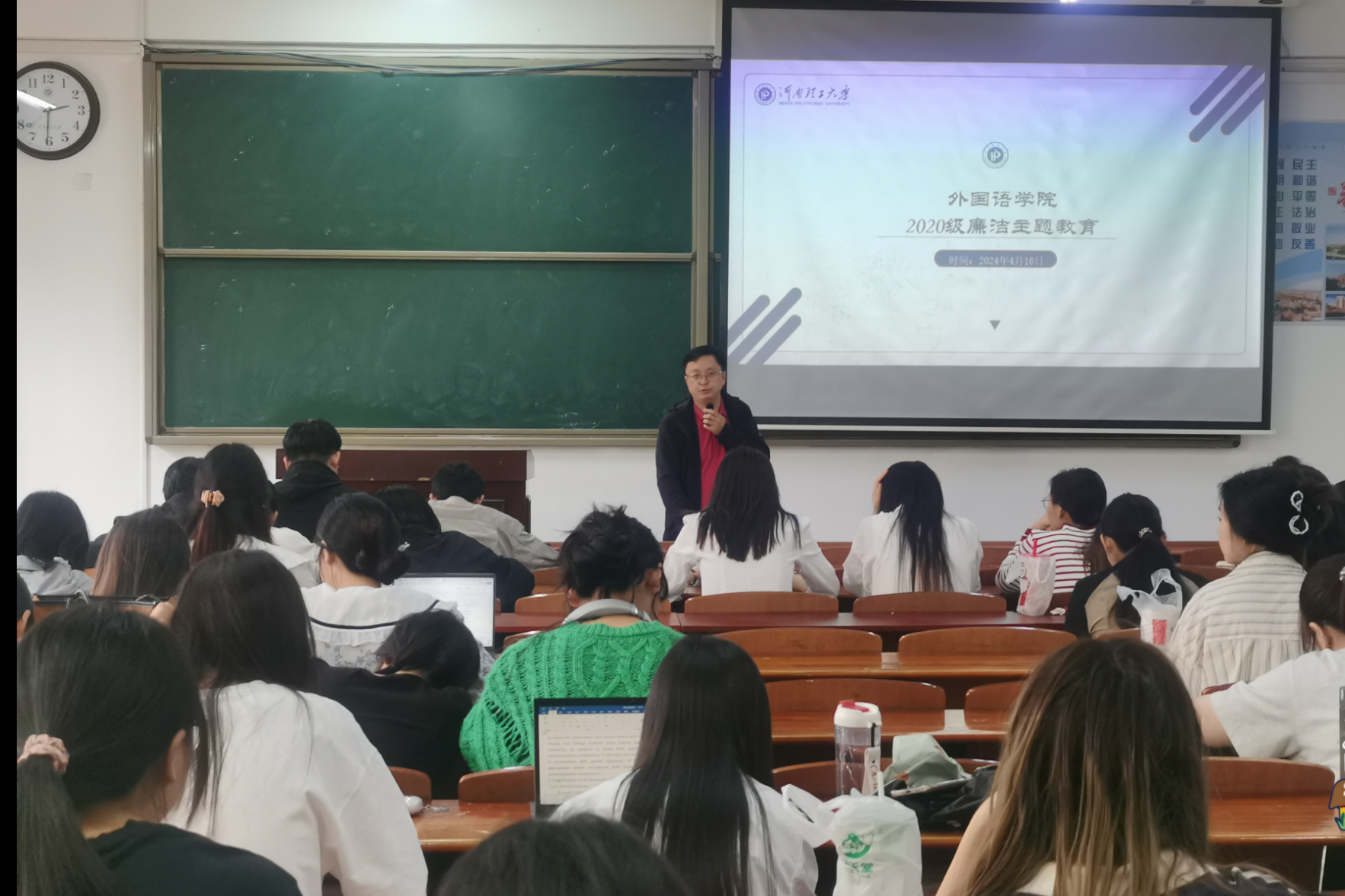 6月18日,外国语学院在文综楼302组织召开2024届毕业生廉洁教育主题班会。学工办主任尹祥教导毕业生学会洁身自爱,廉洁自律,坚守底线,做新时代文明守法的大学生。同时,对毕业生提出三点希望和要求:一要树立正确的价值观,让廉洁自律的美好品质在学习和生活中蔚然成风。二要不断弘扬自强不息、开拓进取的品格。三要尽快融入社会大家庭,干事创业争当表率。