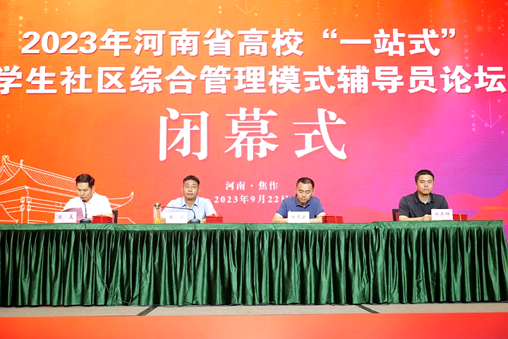 本网讯 (通讯员 胡华伟)9月22日上午,由省委教育工委、省教育厅主办,河南理工大学承办,教育部高校思想政治工作队伍培训研修中心(郑州大学)、河南省教育融媒体运营中心协办的2023年全省高校“一站式”学生社区综合管理模式辅导员论坛在中共修武县委党校圆满闭幕。省教育厅思政处处长陈凯、副处长任龙云、二级主任科员郑燕辉出席闭幕式。全省高校辅导员年度人物、全省高校辅导员素质能力大赛获奖辅导员、全省高校辅导员工作室主持人等辅导员骨干参加闭幕式。闭幕式由校党委学工部部长、学生处处长陈昊主持。