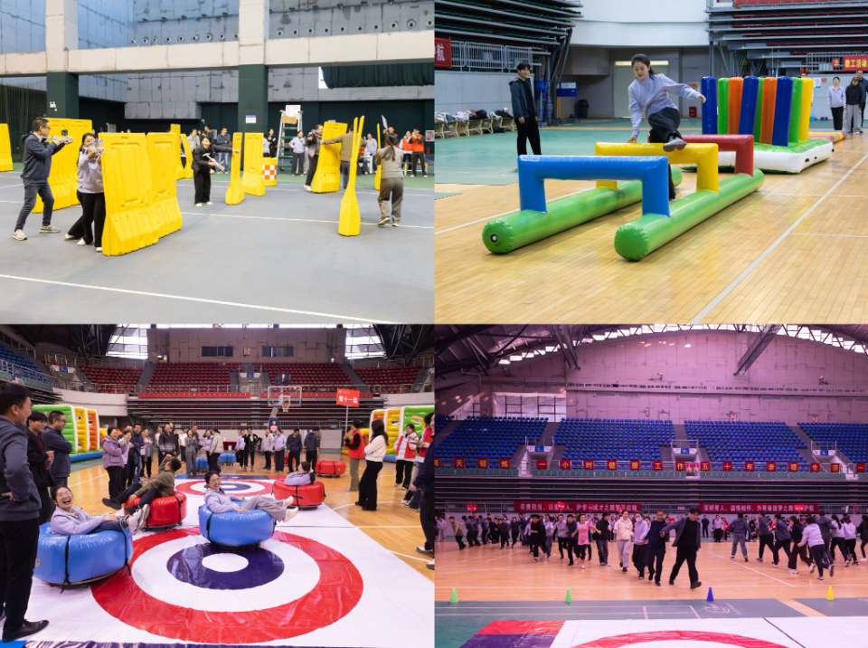 本次运动会共有12个代表队参赛,设置有“贪吃蛇”“真人冰壶”“勇往直前”和“真人CS”等4个趣味比赛项目。在“贪吃蛇”比赛项目中,各队队员手拉手组成“长蛇”,默契配合绕杆,努力奔跑争取在最短时间到达终点;在“真人冰壶”比赛项目开始前,各队围圈讨论比赛策略,比赛过程中根据赛况适时调整“冰壶”角度方向,精准发力努力将“冰壶”打进高分区域;在“勇往直前”赛道,各队参赛队员接力冲刺、跨越关卡,确保在最短时间完成比赛;在“真人 CS”战场,红蓝两队队员分工协作、攻防有序,战术配合间尽显战队向心力、凝聚力。