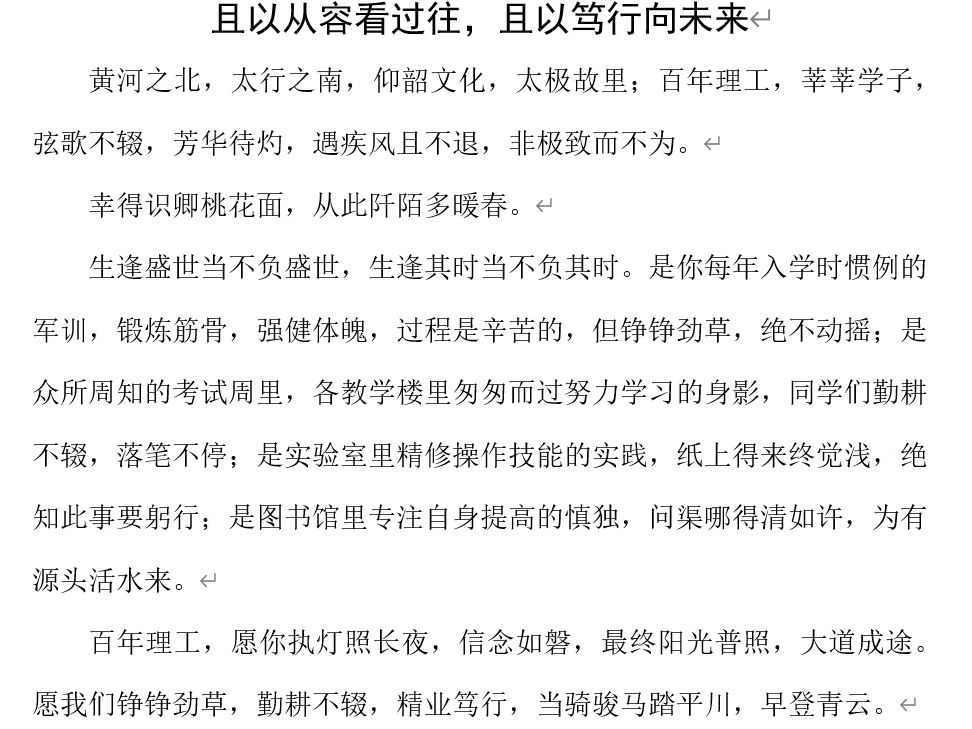 活动伊始,工作人员向各年级学委发送比赛信息进行宣传。学院学生接到通知后积极报名,并按照投稿要求将电子版稿件发送至工作人员邮箱,完成参赛投稿。此次比赛涌现出众多优秀作品,其中,晁佳瑶同学的作品《栉风沐雨砥砺行,春华秋实满庭芳》从我校发展的百年历程、百年成就和展望未来三个方面,叙说我校自创立以来重要历史事件和校园变迁史,总结了我校在科研、人才培养方面的显著成就,表达了对我校未来发展的美好愿景;岳增錡同学的作品《且以从容看过往,且以笃行向未来》描绘了我校同学在教学楼和图书馆努力学习的身影以及我校四季不同的美景,表达了对百年理工的美好祝愿。除了以上展现的优秀作品,还有米永欢同学的作品《理工岁月长,风华映今朝》,以自己在校经历,现身说法阐述理工大“明德任责”校训和“好学力行”校风对其在校生活的深刻影响。随后进入作品筛选阶段,工作人员将所有文稿整理分类,由承办单位相关工作人员担任此次作品筛选的评委,评委们秉持公平、公正和择优的原则对作品进行评鉴打分,选出优秀作品。最后,公布此次活动评选结果,其中米永欢、晁佳瑶、岳增錡、唐佳怡、孙艺颖、黎晨6名同学的作品在本次比赛中脱颖而出,成功推选至校赛。