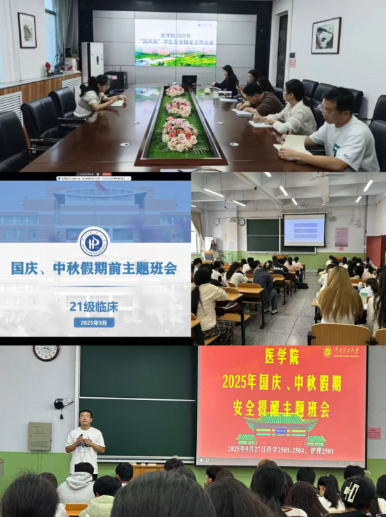 为切实增强学生的安全防范意识,确保国庆假期期间学生的人身和财产安全,9月28至9月29日医学院全体辅导员分别开展国庆假期安全主题班会,假期间为学生筑牢安全防线。