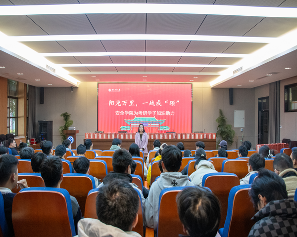 为进一步增强2026届考研学子备考信心,缓解考研冲刺阶段的压力,12月6日下午,安全学院在101会议室举办了“阳光万里,一战成硕”考研助力活动,学院党委副书记李静、全体辅导员与近200名考研学子共同参加。