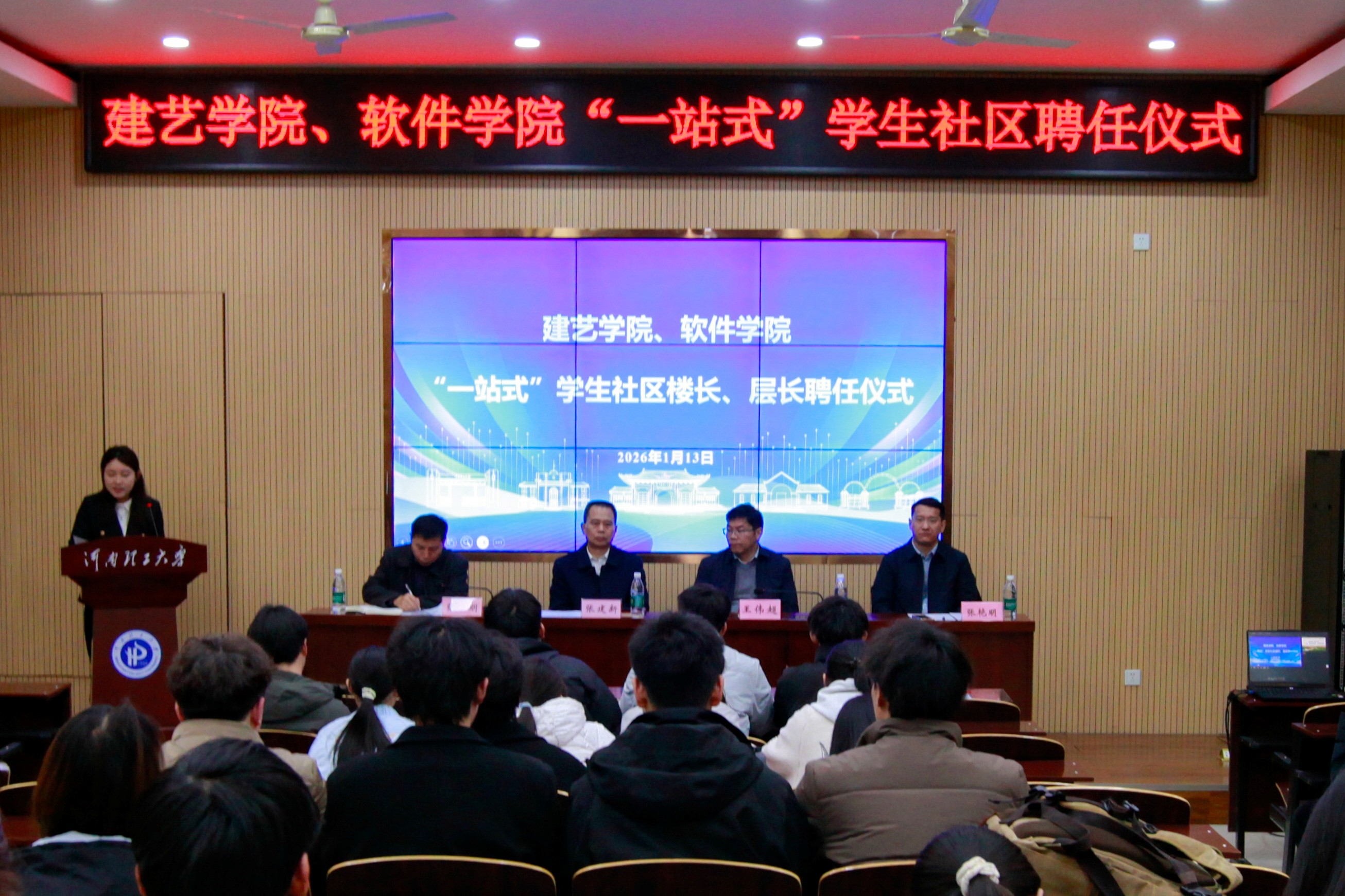 1月13日,建艺学院、软件学院“一站式”学生社区楼长、层长聘任仪式在北校区学术报告厅顺利举行。建艺学院党委书记张建新、软件学院党委书记王伟超、建艺学院党委副书记张明、软件学院党委副书记张艳明出席仪式,两院辅导员、“一站式”学生社区楼长、层长及功能型党团组织负责人共同参加。仪式由张明主持。