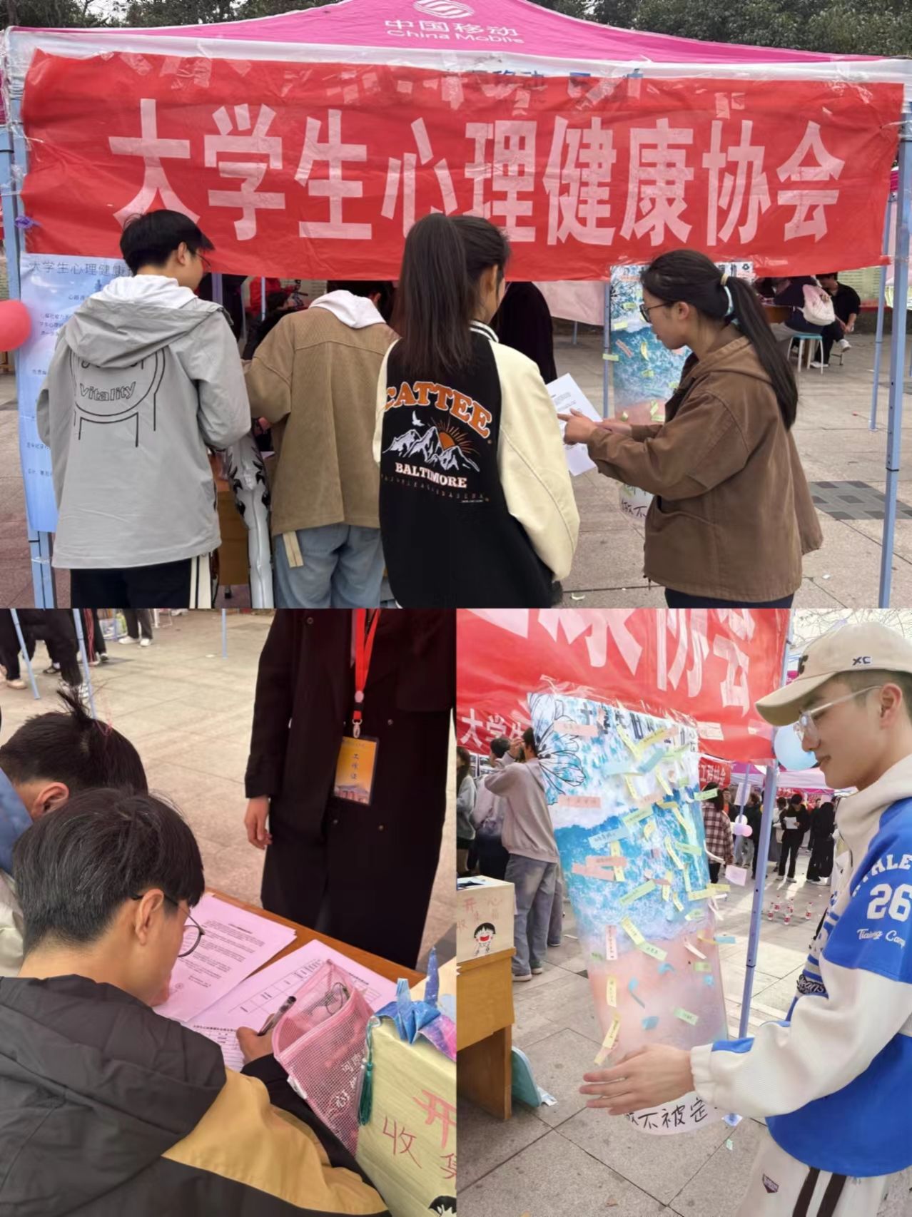 根据上级团组织关于学联学生会改革精神,学生社团改革要求,落实立德树人根本任务,我校积极组织开展招新活动,大学生心理健康协会积极配合校级团组织以及学联学生会要求,在招新时间段内开展三项活动,一是传递积极情绪,描述一件令自己感到愉悦的事情并投入“开心收集箱”的活动;二是“撕掉固有标签,做不被定义的自己”,帮助学生挣脱坏情绪,撕掉标签,建立合理积极认知;三是“爱的拥抱”活动,由穿玩偶服装的协会成员向过路的同学展开双手,用拥抱传递善意。活动现场气氛热烈,不少同学驻足参与。